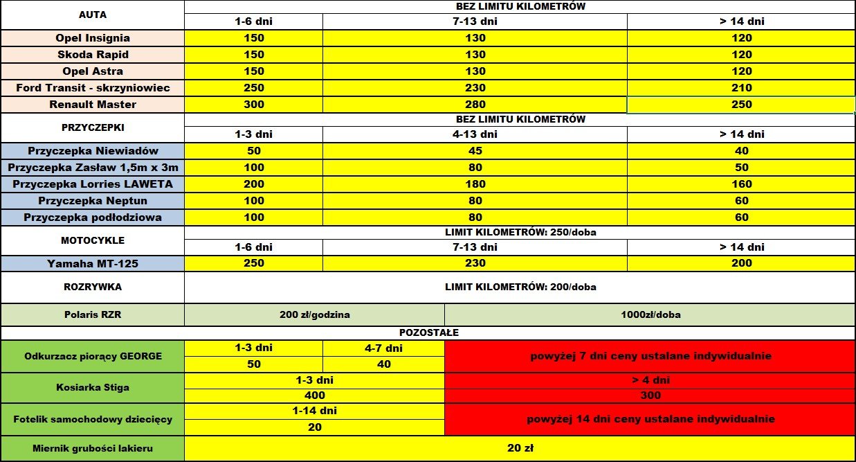 Ceny obowiązują podczas wynajmu w granicach PL. W przypadku wyjazdu za granicę, doliczana jest dodatkowa opłata ustalana indywidualnie.
